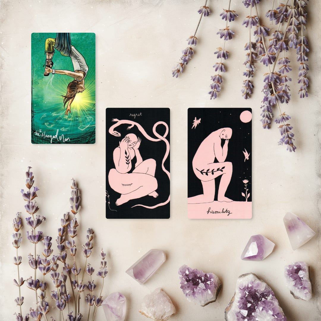 In the tarot, The Tethered One (The Hanged Man in traditional tarot) invites surrender and letting go of control, calling us to trust the process and find wisdom in waiting.